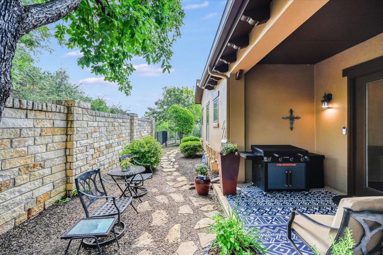 Park in back on Rivalto Circle and enter thru Side Patio Door. Absolutely gorgeous Townhome with two spacious bedrooms plus an office in the highly desired development of Tuscan Village Lakeway 55+ community. This in an END Unit that offers superb privacy with a stone wall and private patio for a true peaceful garden feeling. Wonderful open and bright floor plan with the largest Gourmet kitchen available in the Townhomes. Granite counters and stainless gas appliances and a generous amount of Alderwood cabinets make this a true chefs dream. This unit has been highly upgraded including wood floors with no carpet, fresh painting of the walls, ceilings, closets trim and doors and plantation shutters throughout the home. All the kitchen appliances have been replaced, newly replaced toilets and 25 newly installed LED ceiling can lights. AC unit in the attic recently replaced. There is a beautiful attached two car garage plus easy access to several adjacent guest parking spaces. The Main Bedroom has a high ceiling, crown molding and tons of natural light. There is a huge closet, an oversized bathroom and a walk-in shower with a built in shower seat. The office faces the front of the home and offers a rotunda with ample windows for a bright and cheerful space. The private patio off the living room is wonderful for morning coffee or cooking out on the grill. The Tuscan Village amenities rival most resorts and include a heated community pool, hot tub, fitness center, water aerobics, yoga studio, putting green, pickleball court, walking trails, weekly and monthly activities. All this is conveniently located within minutes to the heart of Lakeway and Bee Caves for shopping, dining, golf, tennis, entertainment, medical services and more! Buyers are responsible to verify any and all information including but not limited to condition, size and financial status.