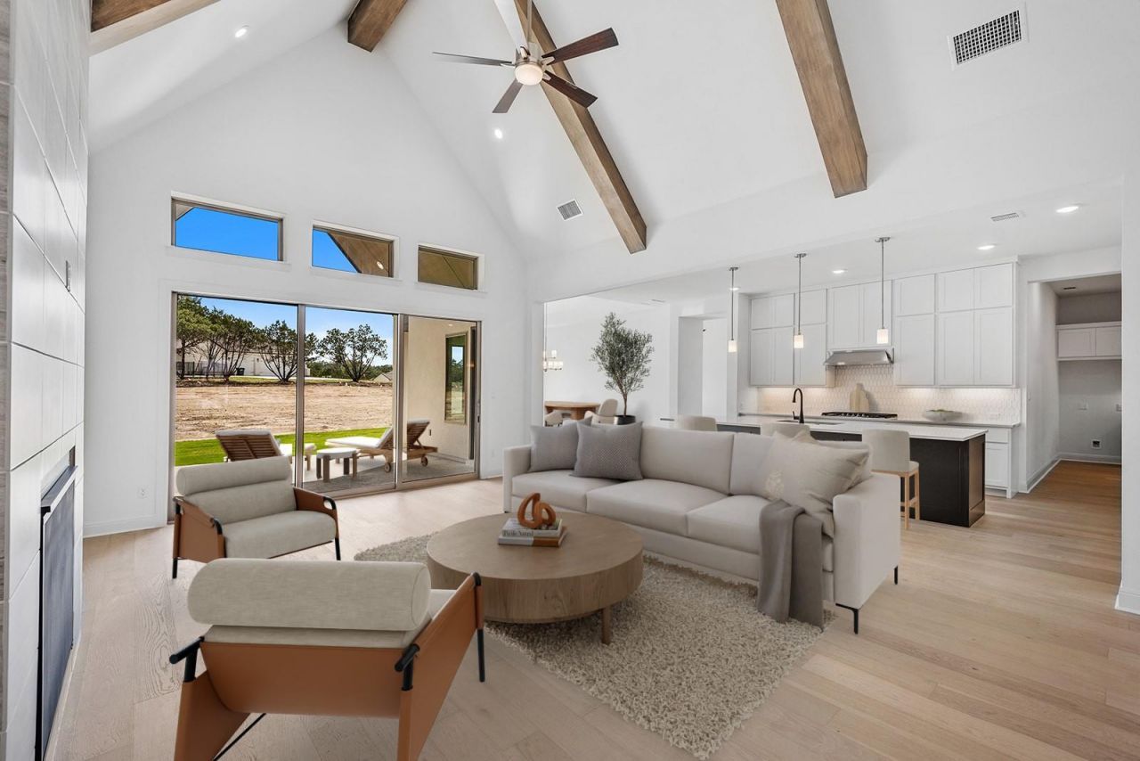 Set within Liberty Hills scenic Hill Country, Clearwater Ranch is a 1 acre plus estate neighborhood designed for space and privacy, in a relaxed setting. Located in this community, this single story Marley floor plan spans over 4,000 sf and offers 4 en suite bedrooms, delivering comfort and privacy throughout.Upon entry, the foyer is flanked by bedroom 4 on one side and a private home office on the other, creating a welcoming introduction to the home. Just beyond, the main living area opens with wide plank wood floors, soaring ceilings with exposed beams, and a dramatic floor to ceiling tiled fireplace. Expansive triple pane sliding glass doors open an entire wall to the outdoors, creating seamless indoor outdoor living.The open concept kitchen serves as the heart of the home, featuring an oversized island, abundant cabinetry, quartz countertops, and double ovens, with effortless flow into the dining area located just off the kitchen. Adjacent to the dining space is a game room or second living area, offering flexibility for gathering and recreation. Tucked behind barn doors, the media room provides a private setting for movie nights. This wing of the home also includes bedrooms 2 and 3, thoughtfully positioned for privacy.The primary suite is privately accessed off a hallway near the main living area and offers a peaceful retreat, complete with a boutique style en suite with custom tile, frameless glass shower, dual recessed niches, stand alone tub, his and hers vanities and a spacious walk in closet. On the opposite side of the kitchen, the home is enhanced by a generous pantry, craft or hobby room, utility room, and mudroom, all leading to a spacious 4 car garage designed for everyday convenience and organization.With refined finishes, flexible living spaces, thoughtful design, this home offers elevated living on a 1 acre homesite. Clearwater Ranch amenities include a community park, natural creek, walking trails, and a playground.