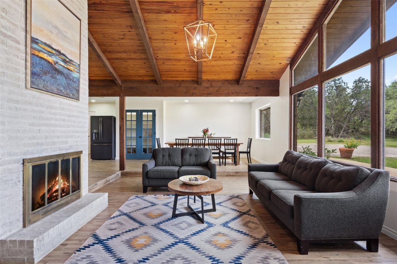 Welcome to 121 Merrywood ~ A stunning mid century modernr residence tucked away on a quiet tree-lined street. This is the kind of home that just feels right when you walk through the door. Exuding warmth and character with an effortless layout. Step inside and youre greeted by the dramatic vaulted ceilings that naturally draws you into the heart of the home. The layout flows effortlessly ? open where you want connection, yet thoughtfully designed to give everyone their own space. The living area - anchored around a stunning wood-burning fireplace, with oversized architectural windows that flood the space with warm Texas sunshine. The kitchen is timeless ? breakfast bar, quartz countertops, and a proper pantry (because storage matters). The spacious primary suite features wonderful views of greenery and woods. The ensuite bath offers a walk-in-shower, dual vanities, and a generous walk-in closet. Guest bedrooms are comfortably sized. The fourth bedroom offers flexibility ? perfect as a home office, hobby room, or creative space. A spacious utility room with a mud area keeps everyday life organized and easy. Out back, youll find a true Texas-sized yard with an impressive covered patio ? ready for game days, backyard barbecues, or simply enjoying a peaceful evening under the stars. Location is just as special. Youre minutes from Downtown San Marcos, the Blanco River, Texas State University and endless opportunity for adventure with tons of hiking trails and outdoor activities nearby. 40 minutes to both Austin and San Antonio.