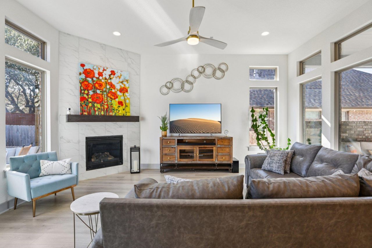 Refined Living in the Heart of Georgetowns Lakeside at Lake GeorgetownWelcome to 133 Lake Spring Circle, a beautifully designed 3-bedroom, 3-bath home offering 2,495 square feet of thoughtfully curated living space. From the moment you step inside, soaring ceilings and an open-concept layout create an airy, welcoming atmosphere ideal for both everyday living and effortless entertaining. Work from home? Worry not, the home office with oversized desktop and shelving provides the ideal workspace in the comfort of your home. The spacious kitchen anchors the home with expansive counter space, abundant storage, and seamless flow into the living and dining areas. A striking fireplace adds warmth and character, while oversized windows fill the space with natural light. The private primary suite offers a peaceful retreat with generous proportions and a well-appointed bath designed for comfort and relaxation.Outdoor living truly sets this property apart. In addition to the covered back patio, the fully finished backyard features a large raised Trex deck, perfect for hosting gatherings or enjoying quiet evenings outdoors. A second side patio provides an additional private sitting area, and the hot tub creates a resort-style experience right at home. The fenced yard offers both privacy and functionality, making the outdoor space as versatile as the interior.Located just minutes from Lake Georgetown, scenic trails, parks, and highly rated schools, this home blends comfort, convenience, and lifestyle.Most of the furnishings currently in the home are available and negotiable; select items may be excluded. Any furnishings to convey will ideally be addressed under a separate bill of sale.