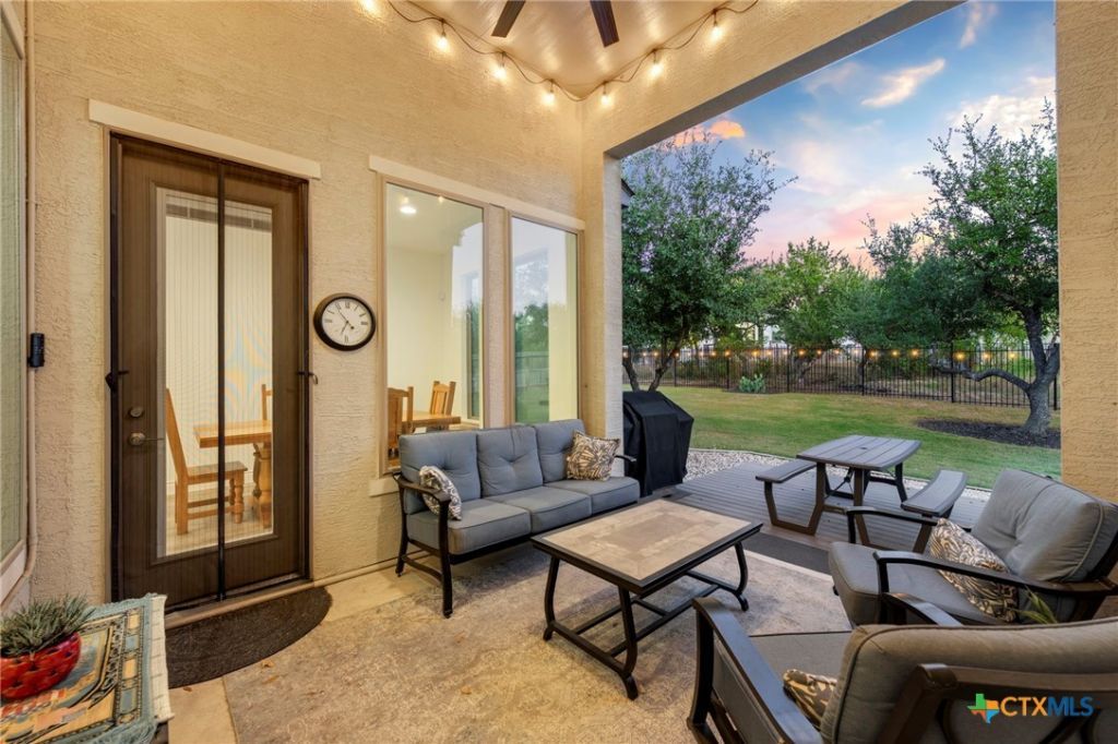 Experience refined Hill Country living in this stunning two-story home perfectly situated on a beautifully landscaped homesite in one of Bulverde's most desirable communities. Designed for both comfort and sophistication, this residence offers an inviting open-concept layout with high ceilings, abundant natural light, and timeless finishes throughout. The gourmet kitchen features a spacious center island, custom cabinetry, gas cooking, and stainless-steel appliances-all flowing seamlessly into the dining and living areas. The primary suite provides a private retreat with a spa-inspired bath, oversized walk-in shower, and generous closet space. Step outside to a beautiful covered patio ideal for entertaining or quiet evenings, overlooking a lush backyard with mature trees and peaceful privacy. Additional highlights include a dedicated study, upstairs oasis for the kids, and an oversized two-car garage. Located just minutes from Hwy 281 and Blanco Rd, this property offers easy access to shopping, dining, and top-rated Comal ISD schools-while maintaining the tranquility and charm that define Bulverde living.