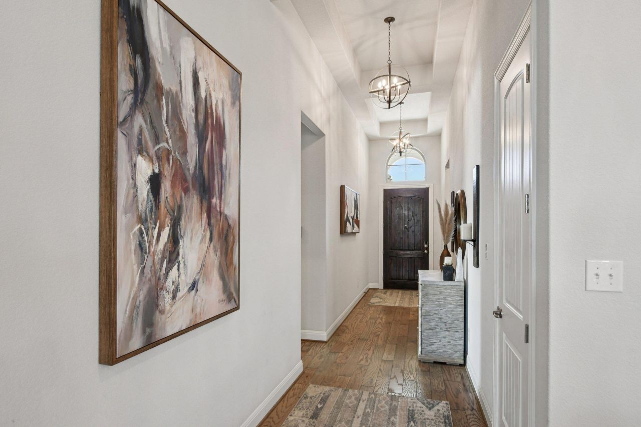 Pristine 1 story Sorento home with high ceilings. Enjoy upgrades at every turn, perfectly positioned on a corner lot in a subdivision across from Lake Pflugerville. Imagine morning walks along the water, weekends spent at the lakeside beach, fishing at sunset, or miles of scenic trails right outside your community. This home is a lifestyle. The crisp exterior is complemented by an oversized driveway, a 3-car garage, and permanent roofline lighting that elevates every evening, whether its holiday season or just another beautiful Texas night. Thoughtfully designed landscaping creates a sense of arrival every time you pull in. Inside, the foyer opens to an inviting living room and kitchen, where upgraded lighting and hardwood flooring elevate the space. The living room offers a cozy retreat, while the kitchen impresses with an oversized granite island perfect for gathering, casual meals, or entertaining. Abundant cabinetry and counter space provide room for everything. A versatile flex space at the rear of the home adapts to your needs, serving as a game room, gym, playroom, or second living area. The spacious primary suite offers a peaceful escape, and the spa-like bath features a garden tub, double shower head walk-in shower, dual vanities, and a custom walk-in closet with center island dresser designed for effortless organization. Step outside to a massively oversized covered patio, an entertainers dream. With ample space for dining, lounging, and hosting, plus two ceiling fans for comfort, this backyard retreat was designed for Texas evenings, weekend barbecues, and relaxed outdoor living. Residents enjoy resort-style amenities including a pool, clubhouse, playground, fitness center, and miles of trails, all while being minutes from the 130 Toll, Austin Executive Airport, and ABIA. Plus, youre just moments from shopping, dining, and movie nights at Stone Hill Town Center. Live where convenience meets recreation and every day feels like a getaway.