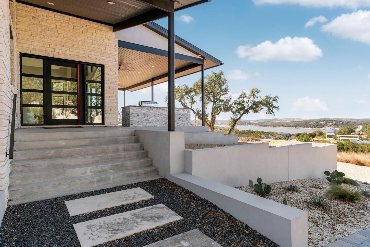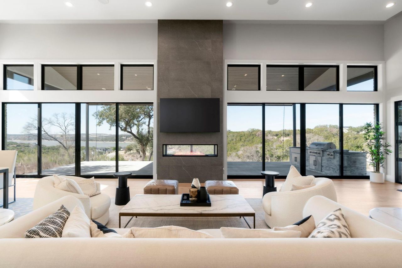Luxury Lake Travis home with panoramic lake views, built by acclaimed Sunshine Builders, offering exceptional craftsmanship, energy efficiency, and resort-style living. This 6,107-square-foot custom estate features a dramatic two-story living room with a full wall of glass overlooking Lake Travis, creating a seamless indoor-outdoor connection and breathtaking water views. Ideal as a primary residence or second home / lake home, the property offers 5 bedrooms and 6 bathrooms, including a private primary suite wing with a dedicated HVAC system. Additional features include three HVAC systems, two tankless water heaters, Level 5 drywall, a standing seam metal roof, and full foam insulation for impressive energy efficiency, with a July electric bill of just $268. The home includes two full kitchens with Thermador appliances, with the main kitchen never used, plus a large walk-in pantry and two sets of washer and dryers. Outdoor living features a covered patio with a full outdoor kitchen and BBQ, perfect for entertaining. A spacious game room provides flexible living space for media or guests. The rare 5-car garage offers high ceilings, side-mounted openers, and room for vehicles, a workshop, toys, boat or RV storage. The .92-acre lot allows space for a guest house and offers the potential to add a private helicopter helipad. Underground utilities and a buried propane tank enhance long-term functionality and aesthetics. The property includes the ability to continue renting a boat slip at a nearby marina, just minutes away, water, electricity, and a private storage locker. An adjacent 1.24-acre lot is also available, allowing the opportunity to build a second home and create an ultimate family compound. A rare Lake Travis luxury estate combining views, garage capacity, marina access, and expansion potential.