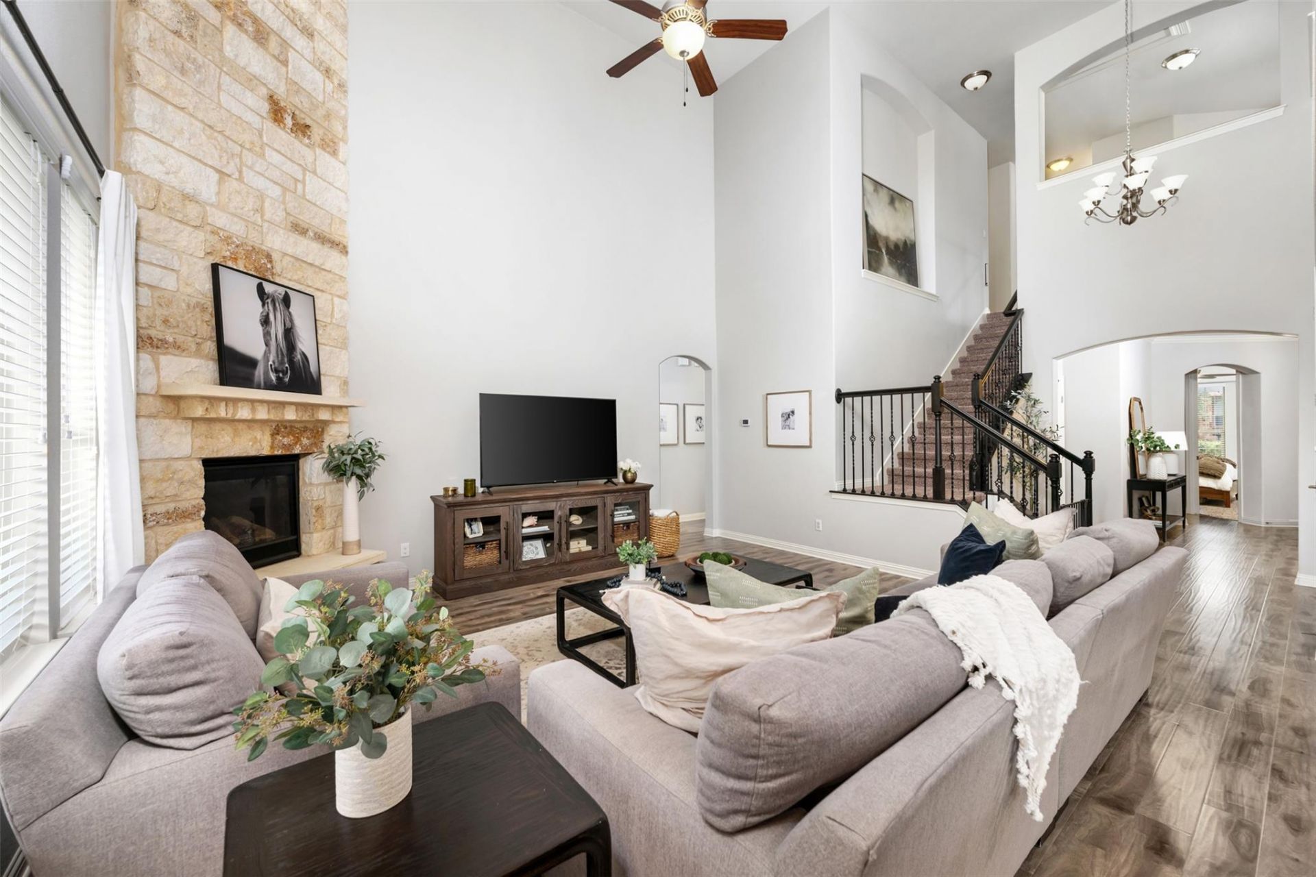Located in the gated Caprock section of Crystal Falls in Leander, TX, this 4-bedroom, 3-bath residence offers 3,296 sq ft with a layout designed for both elevated living and functional flexibility. The main level includes the primary suite, a secondary bedroom, and a dedicated office, supporting a range of living arrangements. The kitchen is appointed with granite countertops, KitchenAid appliances, gas cooktop, double ovens, and a sunny breakfast nook. Opening to a living area with soaring ceilings and a floor-to-ceiling stone fireplace that serves as a central design feature. Attractive luxury vinyl plank flooring. Upstairs, two secondary bedrooms, a spacious game room and dedicated media room create additional zones for entertainment or flexible use. A covered patio extends the living space outdoors across the lush lawn. Positioned within the desired Crystal Falls master-planned community with access to amenities, golf, tennis courts, pools, parks and neighborhood walking trails. Located near major groceries like H-E-B and Randalls, 183A Toll Road for regional connectivity. Approximate distance to Austin-Bergstrom International Airport (~35?45 mi). Located within the acclaimed Leander Independent School District and near exciting ongoing development in the Leander area with Shopping, eating and entertainment at your fingertips!