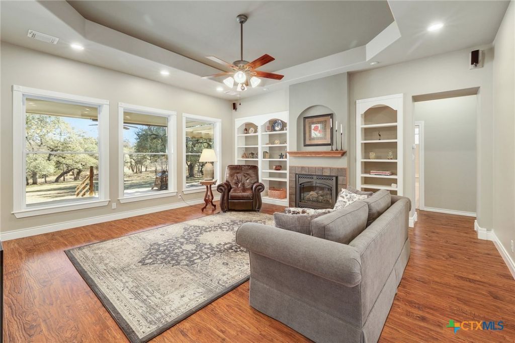 Beautiful Custom Home in the Texas Hill Country! This exquisite residence, situated in a serene gated community within the Texas Hill Country, features a spacious family room adorned with a cozy fireplace and expansive windows that showcase the stunning grounds. The elegant formal dining area, complete with chair rail, a beautiful trayed ceiling, and two-tone paint, is perfect for hosting large dinner gatherings. The generous kitchen provides ample storage, a central island, and includes a cozy dining nook. The spacious primary suite boasts an exquisite trayed ceiling and offers relaxing views of the surrounding property. The opulent primary bath includes a garden tub, a separate glass-enclosed shower, and two sizable walk-in closets. In addition to the three spacious bedrooms, a spacious study or office near the entryway is ideal for remote work. A large laundry room provides enough space for handling laundry, accommodating an extra refrigerator or freezer, serving as a hobby area, playroom, or even a comfortable spot for pets. On the property, you will also find a substantial 24 x 40 finished workshop with an 8 x 7 rollup door and a 23 x 24 finished work/hobby room. Additionally there is a 24 x 30 building with two 10 x 8 rollup doors to store your boat, mower or extra vehicles. Relax on the extended covered rear patio and embrace the tranquility of country living while enjoying the picturesque views of the property, enhanced by towering native oak trees.