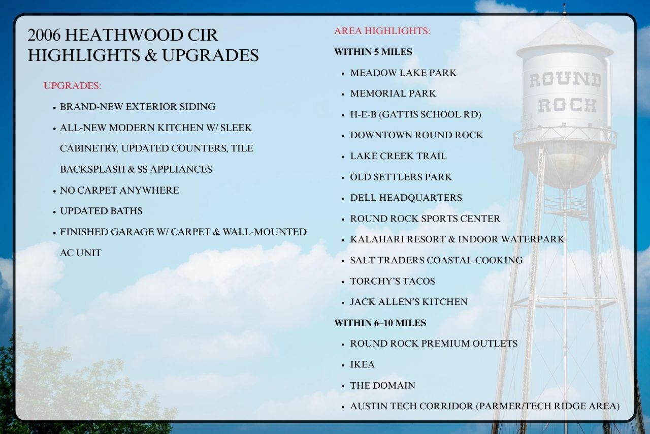 Freshly updated & investor-ready, this Round Rock single-story delivers modern style, strong rental returns & a rare oversized lot in a prime location. Brand-new siding boosts curb appeal, while the bright open layout is filled w/ natural light from wide windows & French doors. Inside, the fully updated modern kitchen shines w/ sleek cabinetry, new counters, tile backsplash, SS appliances & abundant storage?perfect for long-term durability. No carpet anywhere, offering easy upkeep for tenants or owners. The finished garage adds huge value thanks to wall-mounted AC, full carpeting & flexible use as a gym, workshop, studio or bonus rec space. All bedrooms are generously sized, w/ an en-suite primary, updated baths & fresh flooring throughout. The massive backyard provides endless potential for expansion, landscaping or outdoor living. With a low 1.7% tax rate & a profitable rental history, this property is ideal for investors seeking immediate income. Location is unbeatable?minutes to Downtown Round Rock, The Domain, Old Settlers Park, Round Rock Sports Center, Kalahari Resort, Dell HQ, H-E-B, Target, Ikea, Round Rock Premium Outlets, local dining at Salt Traders, Torchys, Jack Allens, and quick access to I-35, 45 & 130. Parks, trails, entertainment, shopping & top major employers are all within a short drive, making this an ultra-attractive long-term hold in one of Austins fastest-growing corridors.