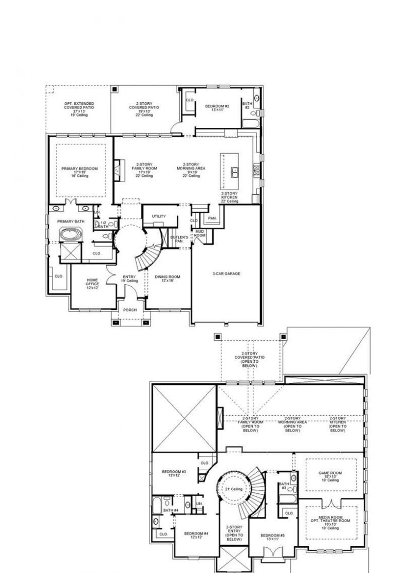The grand entryway unfolds to reveal a sweeping curved staircase. Hardwood floors throughout living areas. French doors open into a home office, while across the hall, the formal dining room awaits. Step into the two-story family room, which offers a warming wood mantel fireplace and a wall of windows. The morning area seamlessly connects the living space to the kitchen, which boasts an island with built-in seating, a double wall oven, 6-burner gas range top, ample counterspace, a walk-in pantry, and a butler's pantry, with easy access to the utility room. The primary suite features a wall of windows and French doors that open into the primary bathroom. This retreat includes dual vanities, a freestanding tub, a separate glass-enclosed shower, and two walk-in closets. A private guest suite off the morning area provides comfort. Upstairs, discover a game room with expansive windows and an adjoining media room for entertainment. Secondary bedrooms with walk-in closets and a Hollywood bathroom, along with an additional guest suite, complete the second floor. Step outside to the extended two-story covered backyard patio. A mudroom is just off the three-car garage.