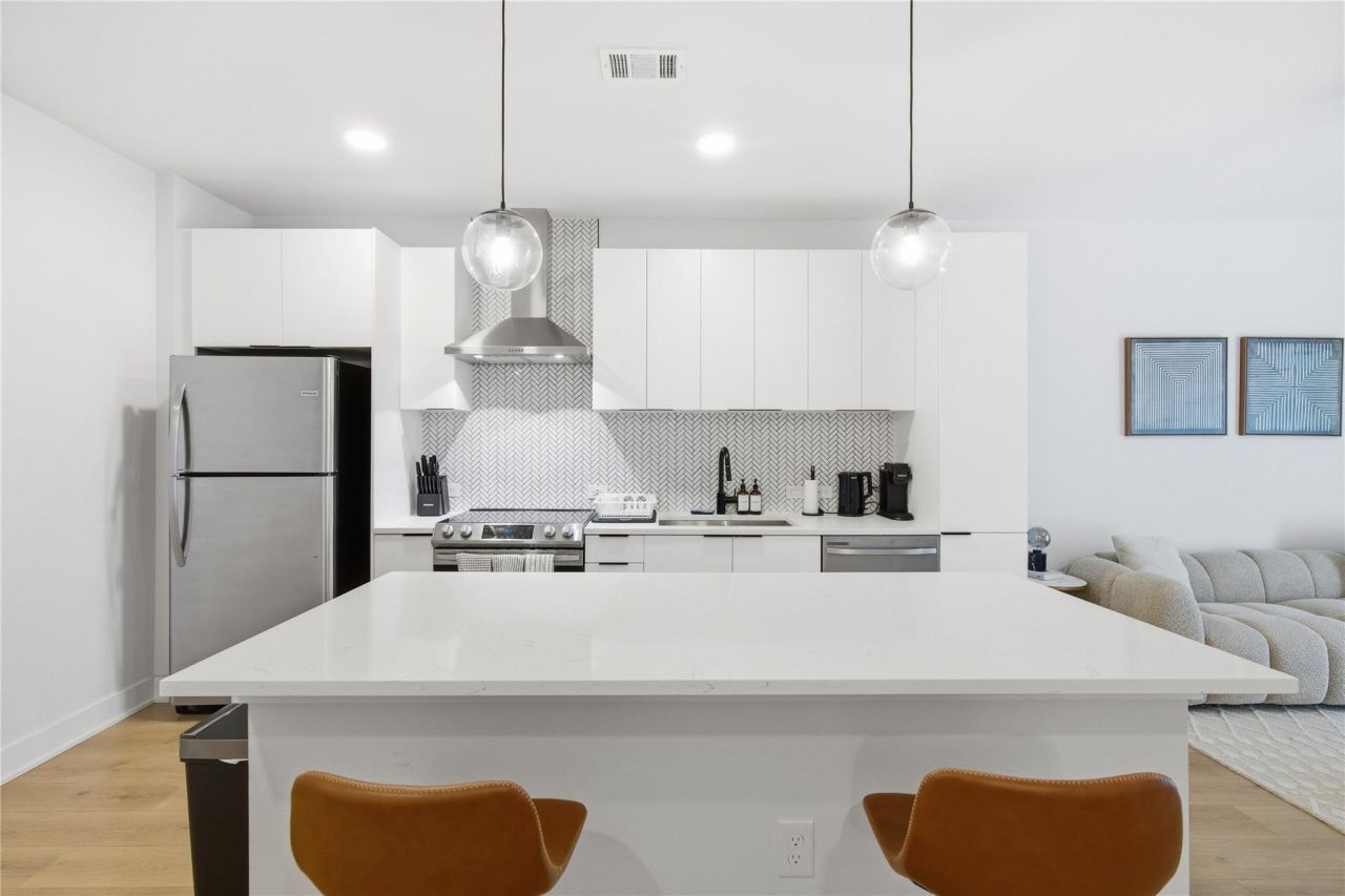 Live in style at Cascade Condominiums with this bright and modern second-floor 1-bed, 1-bath condo perfectly situated near the University of Texas, the Medical District, and Downtown Austin. Ideal for students, medical professionals, or anyone seeking a sleek urban lifestyle, this unit offers elegant comfort, security, and convenience in one of Central Austins most desirable communities. Step inside to an open-concept floor plan filled with natural light. The contemporary kitchen features a large quartz island with pendant lighting and seating for two, stainless steel appliances, modern cabinetry, and ample prep space?perfect for cooking, studying, or entertaining. The living area extends onto a private balcony overlooking the serene interior courtyard and sparkling pool, creating an inviting space to unwind. The spacious bedroom includes a generous sized closet, while the modern bathroom offers a quartz-topped vanity, oversized mirror, and a deep shower tub. An in-unit laundry area provides added convenience and storage. Residents at Cascade enjoy resort-style amenities, including a fully equipped fitness studio, a sophisticated club room, co-working space, grilling stations, and a relaxing pool area. The building features secure entry, carpeted corridors, a modern lobby, and a dedicated mail and parcel area. This unit also comes with one reserved EV parking space in the gated garage. With scenic parks and trails moments away and the vibrant energy of Lamar Boulevard and Downtown Austin at your doorstep, this second-floor condo delivers the perfect blend of comfort, style, and unbeatable location.