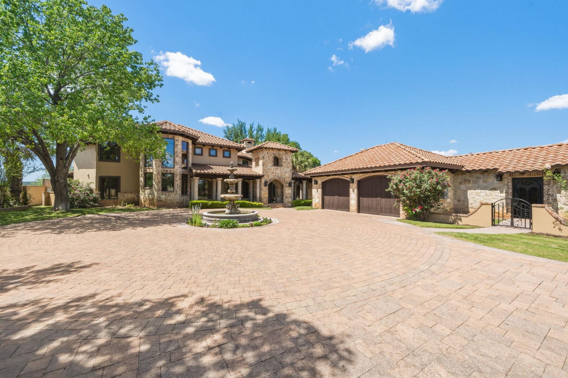 Breathtaking waterfront gated estate offering the ultimate private retreat. This 4,910 sq. ft. Estate is a resort-style sanctuary tucked behind artistic wrought-iron gates with a grand circular drive and a flowing fountain. The backyard is an entertainers dream, featuring a sparkling negative-edge pool, waterfall, spa, and a full outdoor kitchen with a custom rustic wood-fired pizza oven. Boaters will enjoy a private dock with a 24 boat lift, dual wave runner lifts, and a spacious sun deck for soaking up Hill Country views. Inside, grand soaring windows, polished marble floors and exquisite ironwork lead to sophisticated living spaces. The gourmet kitchen boasts knotty alder cabinetry, granite counters, and a hand-carved stone fireplace. The lower level is designed for fun with a fully equipped home theater, living room, and three spacious guest bedrooms. This level gives you direct access to your outdoor pool, spa and dining areas. A separate private-entry Guest Villa provides the perfect space for a home office or guest suite. Car enthusiasts will appreciate two detached 2-car garages, both fully insulated with dedicated HVAC. From the luxurious primary suite with a clawfoot tub and private balcony to the panoramic upper-porch views, this home offers uncompromising luxury in a prestigious setting. Experience the beauty of the Hill Country on your own private shoreline.