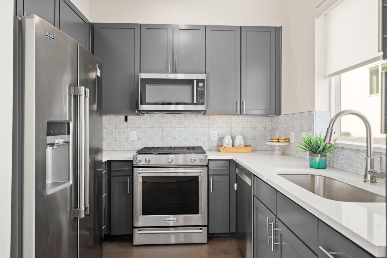 Stylish, modern townhome in vibrant East Austin, just minutes from Mueller and a quick 10 min drive to downtown. This three-story unit offers a practical layout with a two-car garage on the entry level, open living on the second floor, and two bedrooms with ensuite baths upstairs.Enjoy the peace of mind of move-in-ready living! The main level features tall ceilings, abundant natural light, wood-look tile flooring, and a private balcony off the living area. The open dining space flows easily into the kitchen, where youll find quartz countertops, stainless steel appliances, Shaker-style cabinetry with pantry storage, decorative backsplash, and a window over the sink.Upstairs, the primary suite includes its own balcony, generous closet space, and a well-appointed contemporary ensuite bath complete with a quartz vanity and frameless glass walk-in shower. The secondary bedroom also has a private bath with a chic shower/tub combo. A powder room and laundry closet are conveniently located on the main level. Google Fiber available.Easy access to I-35, 290, and 183 makes getting around town simple, whether you're heading to Mueller Lake Park, nearby restaurants, or downtown Austin. This eastside gem is clean, well-designed, and perfectly located. Dont miss out on this hot opportunity ? secure a showing today!