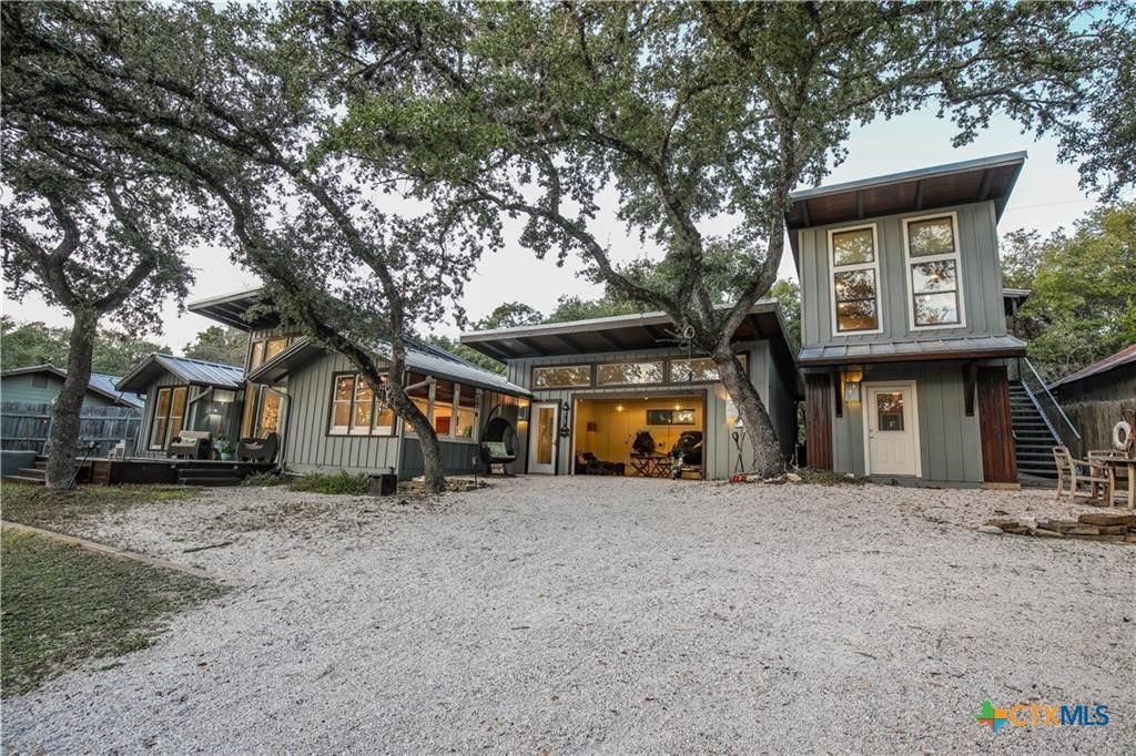 City sophistication meets Texas Hill Country charm in this beautifully renovated (2010) home, tucked within a private lake community overlooking Lake Travis. The main residence offers two spacious living areas with soaring vaulted ceilings, transom windows, and sliding glass doors that frame breathtaking lake and hill country views. The open-concept kitchen flows seamlessly into both living spaces and the dining area?ideal for everyday living and entertaining. The primary suite is conveniently located on the main level and captures serene lake views. A separate secondary structure provides exceptional flexibility, featuring two private suites, each with full baths, wood ceiling accents, slate tile finishes, and separate entrances?perfect for guests, multigenerational living, or rental opportunities. The garage space offers versatility as storage or an inviting outdoor living area, all while enjoying tranquil views of Lake Travis. Whether you're seeking a full-time residence, weekend retreat, or income-producing vacation rental, this property delivers. Residents enjoy access to a nearby neighborhood park with lake access for fishing, boating, and kayaking.