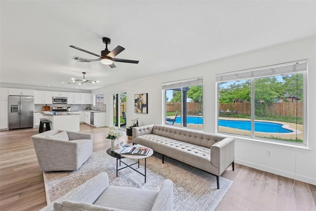 This beautifully updated 2-story home is nestled in a tranquil, established neighborhood and features 4 bedrooms, 2.5 baths, multiple living spaces, and a private pool/spa. As you step inside, you'll be welcomed by a bright and airy interior filled with natural light, crisp white walls, modern light fixtures, and gorgeous hardwood floors that flow throughout the open-concept layout. Off the entry, a formal living or flex space offers versatility, making it ideal for a home office or additional seating area. The large dining room, perfect for entertaining, is adjacent to the chef's kitchen, which boasts a center island, breakfast bar, granite countertops, white cabinetry, and stainless-steel appliances. The kitchen opens to a spacious family room featuring a cozy wood-burning fireplace. Sliding glass doors lead to the backyard oasis, complete with a pergola-covered patio and a sparkling in-ground pool/spa?ideal for relaxation and outdoor fun. Upstairs, retreat to the luxurious primary suite, which includes a sitting area, two walk-in closets, and a spa-inspired bathroom with a dual vanity, jetted soaking tub, and frameless walk-in shower. Three additional guest bedrooms, an updated guest bath, and a convenient laundry room with built-in storage complete the second floor. Located near major roads, shopping, dining, and entertainment, this home provides easy access to all the essentials. Additional highlights include a refrigerator, along with access to highly regarded Round Rock ISD schools. Don't miss the chance to see this gem?schedule your showing today!
