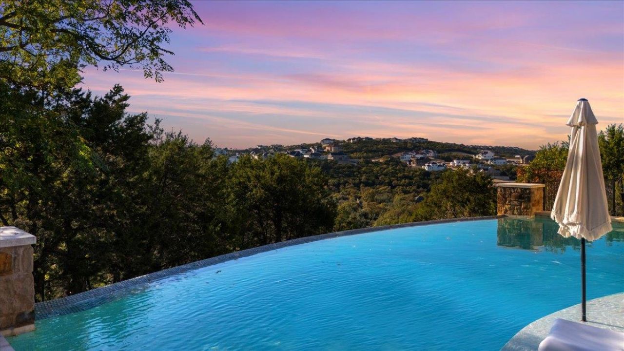 Privately positioned on a quiet cul-de-sac within the exclusive Grand Mesa community, this residence offers the perfect balance of refined elegance and resort-style living?complete with breathtaking views that extend endlessly across the hills. Every element of this home reflects meticulous craftsmanship and architectural mastery. The grand great room is a true showpiece, with six sets of 8 double French doors that open to sweeping vistas, seamlessly merging indoor and outdoor living. The gourmet kitchen is designed to impress even the most discerning chef, featuring granite countertops, top-tier Jenn-Air stainless steel appliances, double ovens, and designer lighting. Step outside and indulge in your private resort retreat. Expansive dual-level decks overlook a spectacular infinity-edge pool that appears to merge with the horizon. Entertain under the stars at the fully equipped outdoor kitchen or unwind by the fire pit as you take in the endless views of the Hill Country. The main residence offers four luxurious bedrooms and three and a half baths, including a serene owners suite with a private balcony and spa-inspired bath that has French doors opening onto the stunning panoramic views of the outdoor patio. Take note of a downstairs bedroom complete with en suite bath that would make perfect mother-in-law quarters. A detached garage apartment extends the estates versatility with two additional bedrooms, a full bath, and a comfortable living area?ideal for guests, extended family, or private staff quarters. Set on 1.184 acres of pristine landscape, this 3,433-square-foot main home plus 702-square-foot guest residence embodies the pinnacle of luxury living. From its timeless Tuscan architecture to its awe-inspiring Hill Country panoramas, this is more than a home?its a statement of elegance, privacy, and distinction. Discover the ultimate in refined living at this Grand Mesa masterpiece?where every sunset feels like a work of art. Welcome home!!