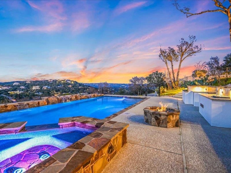 Set on a rare hilltop just over an acre in highly sought-after Westlake Hills and zoned to top-rated Eanes ISD, Vista on Via Media offers panoramic Hill Country views, exceptional privacy, and resort-style living just 15 minutes from downtown Austin.Completely reimagined in a down-to-the-studs renovation, this 5-bedroom, 5-bath home blends modern construction with timeless design. Walls of glass frame sweeping views, while wide-plank white oak floors, soaring ceilings, and expansive living spaces create a warm yet sophisticated atmosphere ideal for everyday living and entertaining.The chefs kitchen anchors the open-concept living and dining areas, featuring a striking Cambria quartz island, custom cabinetry with hidden prep pantry, Sub-Zero refrigerator, Wolf ovens, induction cooktop, dual Bosch dishwashers, and Zephyr wine fridge.Designed for seamless indoor-outdoor living, the home opens to expansive composite decks with stainless cable railings overlooking the resort-style 18 x 38 pool, propane fire pit, and beautifully curated landscaping. A separate poolside guest quarters with private bedroom, full bath, and cabana-style living space adds flexibility for guests, multigenerational living, or a private office.The primary suite is a true retreat with breathtaking views, private deck, coffee bar, bonus flex room, and spa-inspired bath. Generously sized secondary bedrooms and additional flex space upstairs provide versatility for work, fitness, or play.All major systems?including framing, electrical, plumbing, ducting, insulation, doors, and windows?have been replaced, offering the peace of mind of modern construction. Additional highlights include an Empire Boulevard linear fireplace and epoxy-finished garage floors.A rare opportunity to own a private, view-filled sanctuary in one of Westlakes most desirable locations
