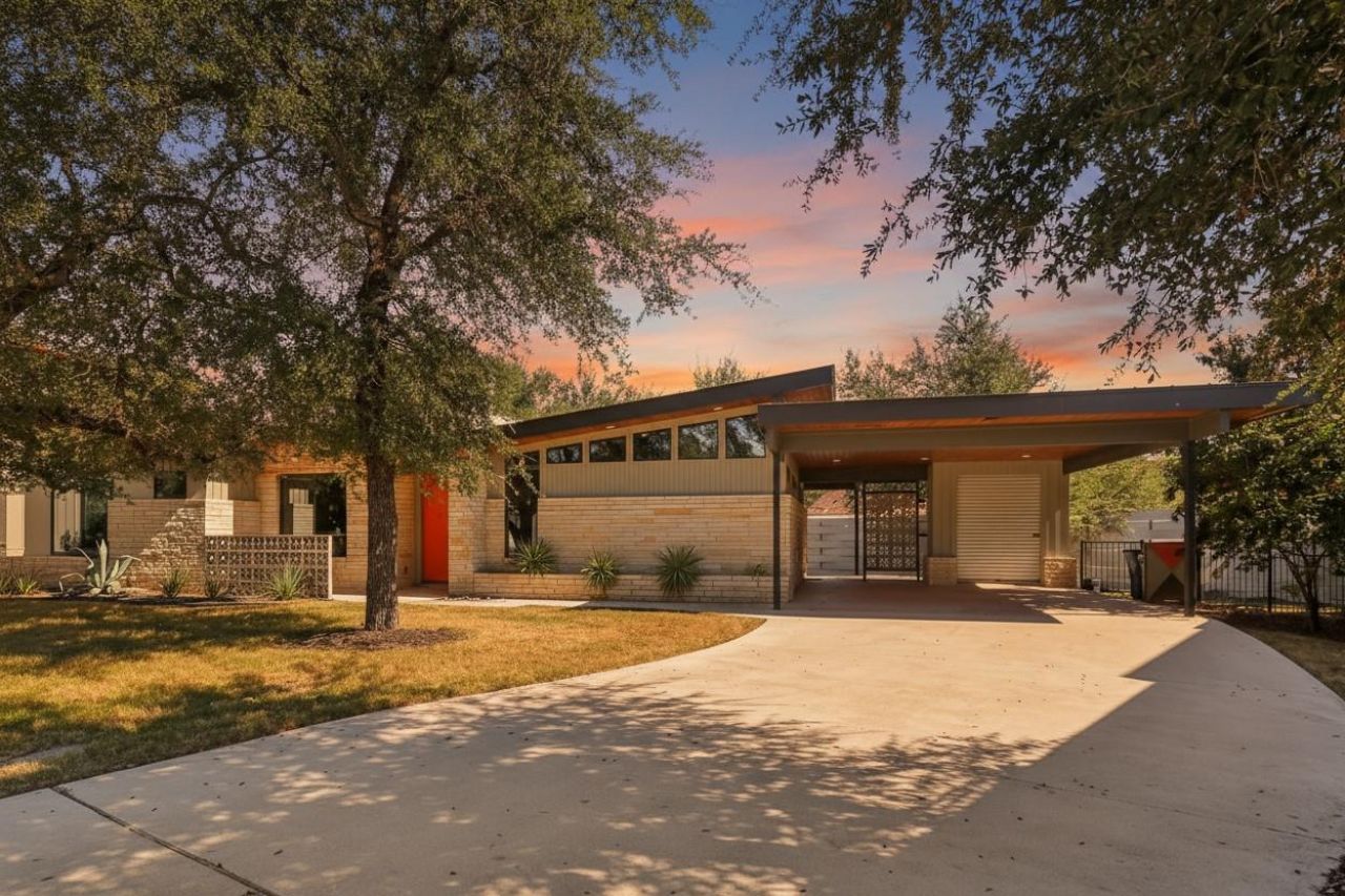 Showcasing superior design and high-end finishes, this single-story mid-century modern home offers an exceptional living experience in Starlight Village. This residence is situated on the largest private lot in the community, providing a rare combination of architectural style and outdoor space. From the street, the homes striking angled roofline, natural stone accents, and covered carport set a tone of sophisticated design. Inside, the home opens up to a voluminous great room defined by an open-concept floorplan, polished terrazzo-style flooring, and soaring ceilings. A stunning wood accent wall adds warmth and texture, while a floor-to-ceiling stone fireplace creates a compelling focal point. An array of clerestory windows floods the space with natural light while maintaining complete privacy. The kitchen is a masterpiece of form and function, featuring sleek quartz countertops with a waterfall edge on the oversized central island. It comes fully equipped with a suite of stainless steel appliances, including a gas cooktop and built-in oven, all set against custom flat-panel wood cabinetry. The tranquil primary suite is thoughtfully separated from the main living areas and includes a large walk-in closet with a built-in organization system. The attached primary bathroom feels like a private spa, with a floating dual-sink vanity, modern fixtures, and a spacious walk-in shower with floor-to-ceiling tile. Two additional bedrooms provide ample space for family, guests, or a dedicated home office. The expansive, fenced backyard is a true highlight, offering a vast green space shaded by mature oak trees?perfect for entertaining or private relaxation. Residents enjoy a lock-and-leave lifestyle with access to a community pool and the convenience of being zoned for top-rated Leander ISD schools. This home's location is ideal for commuters, with the Leander Station Metrorail just moments away.