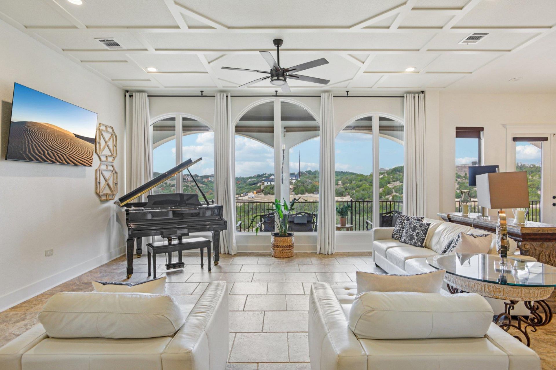Unmatched Mediterranean-style home with sweeping views from the back patio. This home invites you in and provides an immediate sense of space and allure. Starting with the driveway that extends in multiple directions to the manicured landscaping that lines the sides of the home, you're met with immediate relaxation. The pond in the front yard is canvas for an outdoor oasis. Inside, the soaring ceilings and large windows bathe the space in light. The foyer leads to the large living area that can host gatherings of any size. The formal dining room leads in to the well-appointed kitchen fit for a chef. The cabinet space speaks for itself and the oversized kitchen island reveals a breakfast bar for additional seating. The living spaces continues with an office and game room. As you head down the hall, the primary bedroom creates a luxury experience. The en-suite primary bathroom features a soaking tub and separate vanities. Three additional bedrooms provide ample room for relaxation. The separate casita includes one bedroom and one full bathroom to accommodate guests. The backyard is an outdoor oasis complete with a sweeping balcony boasting endless canyon views and the historic Lake Travis lighthouse. These sweeping views can be enjoyed from the back patio, office, game room, primary bedroom, living room, dining room and kitchen! The backyard also includes basketball court, tetherball court, pergola and plenty of yard space. Located just minutes from Lake Travis, this home features everything that Austin has to offer.