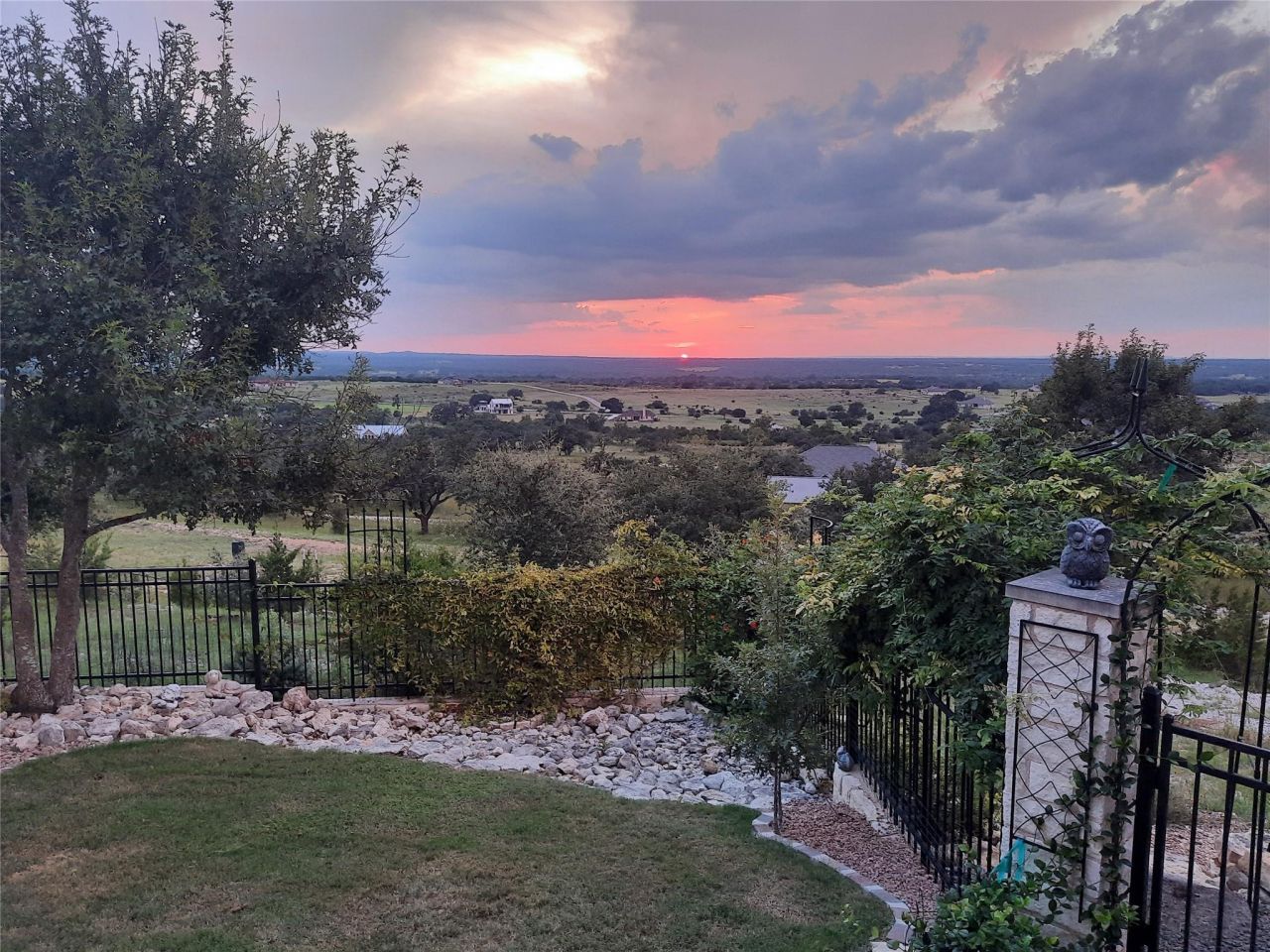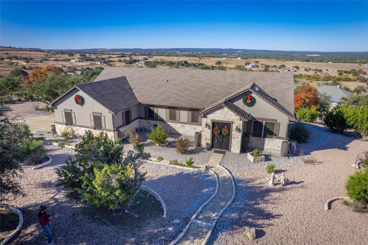 Experience breathtaking Hill Country living in this charming 3-bedroom, 2-bath, single-story home spanning 1,895 sq ft. Designed for comfort and style, this residence features an open floor plan, a beautiful entryway, and a vaulted living room with striking beam ceilings and an electric fireplace.The island kitchen offers stainless steel appliances and ample prep space, perfect for everyday cooking or entertaining. Huge picture windows along the back of the home showcase expansive Hill Country views, filling the space with natural light.The primary bedroom includes private patio access, ideal for enjoying morning coffee or evening sunsets. Step outside to a spacious patio that wraps around the home, Adirondack chairs beckoning you to relax and take in the scenery. Multiple outdoor living areas, peaceful garden spaces, a charming pergola, and thoughtfully placed seating areas invite you to slow down and savor the tranquility.Perched on an expansive acreage homesite with mature trees, this property offers unmatched privacy and room to explore, garden, or simply enjoy the sweeping panoramic views. Additional features include a 2-car garage, sprinkler system, and a small shed for extra storage.This home blends comfort, scenic beauty, and character inside and out, creating a Hill Country retreat thats perfect for entertaining, unwinding, or simply calling your own.