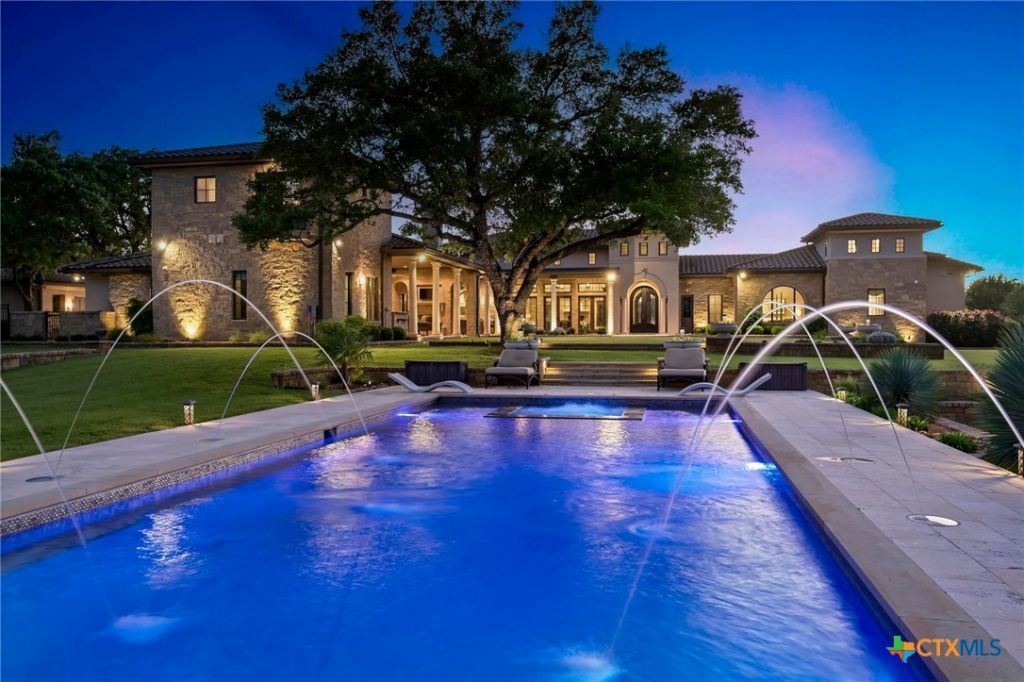 A Hill Country retreat suitable for Texas nobility! Timeless elegance meets impeccable craftsmanship. Built by Steve Richmond & designed by renowned Linda McCalla Interiors, perfection is everywhere. Situated on a grand ~6.7 acre estate, your level of expectation will be raised the moment the gate opens. Understated Texas landscapes invite you thru a grand entry that includes soaring 18-foot ceilings, Venetian plaster & artisan painted walls in multiple rooms. Natural light thru picture windows in public areas and private bedrooms create serene vistas, while world class cabinetry offers abundant storage throughout. Kitchen features leathered granite countertops with waterfall edges and a handcrafted tray ceiling-signed by a local artist...even a butlers pantry with a sonic ice machine, built-in coffee maker, & refrigerator. Stone accents & arches add character throughout. The private primary suite has Wow views, & a brilliant 2-story hers closet boasts a spiral staircase, built-in security cabinetry, & private washer & dryer. Italian tile adorns guest & primary baths, as well as the kitchen backsplash, while handscraped Castle Comb wood floors & 8-foot solid doors add richness. The gameroom features custom etched concrete floors & a second kitchen with full-sized wine fridge. A private poker room includes built-in memorabilia/artwork cases & an additional room for a 2nd office or gym. An office includes custom built-ins & designer paint for an ideal workspace. Outside, a dual-sided fireplace warms the covered patio with outdoor kitchen & multiple seating areas. A pool & outdoor fireplace fit for royalty complete the ambiance. Sweeping Hill Country views, gorgeous outdoor living, & the convenience of being minutes from Lake Georgetown. Additional highlights include 2 private guest suites, circular driveway, fountain, 5 large garage spaces, stained-grade crown molding, & wood beams in perfect spots. Even an insulated shop & tennis/sport court on site.