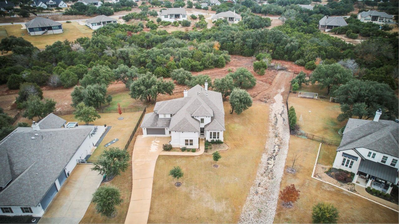 Experience Texas Hill Country living at its finest in this beautiful semi custom estate at 525 Houston Loop. Situated on a long driveway with mature, moderately dense trees and a greenbelt directly behind, this home offers privacy, space, and refined comfort.With 4,207 square feet, the home features five bedrooms and four and a half bathrooms, including a main bedroom downstairs. The stucco exterior is complemented by full gutters, professional landscaping, and a rod iron fence. Two separate two car garages with single doors include epoxy flooring, storage stairs, and a Tonal machine in the second garage that will convey.Inside, enjoy a functional layout with hardwood, tile, carpet, and carpet tile flooring. A private office with double doors and hardwood floors sits near the entry, along with a half bath featuring a pedestal sink. The living room is filled with natural light from a wall of windows and includes a ceiling fan and electric fireplace with wood mantle.The upgraded gourmet kitchen offers recessed lighting, extended counters, a south facing stone island with granite sink, five burner gas range, walk in pantry, and breakfast nook with chandelier. The laundry room includes tile flooring, a sink, built in cabinetry, and washer and dryer that can convey, along with a convenient mud area.The primary suite features carpet, a ceiling fan, and a spacious bath with dual vanities, soaking tub, and glass enclosed shower with dual showerheads. An in law suite downstairs includes an attached bath and walk in closet.Upstairs offers a game room, movie room, and additional bedrooms, including a Jack and Jill setup. Outdoor living shines with an extended covered patio with stained concrete, recessed lighting, built in gas fireplace, and built in gas grill. Two AC units and thoughtful design complete this exceptional Hill Country home.