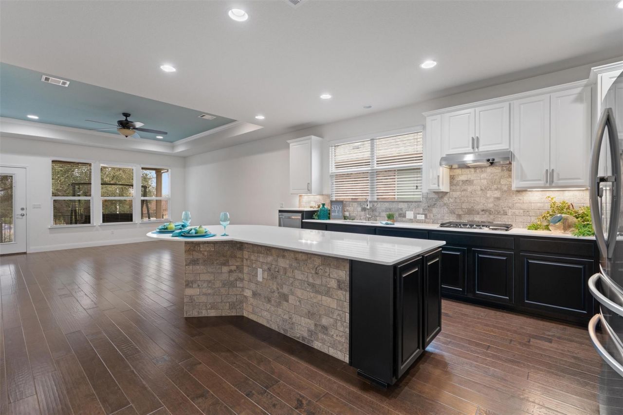 Tree top views fill the rear windows of this Sun City Texas Martin Rey (Longstreet, Lexington) plan, where builder upgrades set this home apart from others of the same plan. A front courtyard-style entrance greets you, then once inside, a Foyer introduces the Study/Computer Room, an Office-at-Home where front windows view the landscaped front yard and streetscape. Glass-front cabinets highlight the Butler's Pantry near the Walk-In Pantry Closet, linking the Office to the Island Kitchen. Engineered hardwood floors add timeless luxury at this thoughtful home, where the Island Kitchen includes a casual bar-top eating area, a nifty place to chat with friends, while enjoying a favorite beverage. Quartz counter tops team-up with shimmering stainless-steel appliances at this remarkable Open Kitchen, where a large window is perfectly-placed above the sink and a gas cooktop is ready and willing in case you decide to cook up a storm! Across from the Kitchen, a Dining Area can be as Formal or casual as you wish, while the nearby Great Room touts a tray ceiling rimmed with crown molding. A wall of windows in the sizable Great Room view the Covered Patio and custom curvy Terrace, a wonderful spot for outdoor enjoyment. Quietly-located at the rear of the home, the Primary Bedroom flaunts yet another tray ceiling, while a trio of windows view the splendid Terrace. Meanwhile, the ensuite Primary Bath hosts dual vanities, a Walk-In Shower, and a roomy Walk-In Closet. On the side of the home, the Guest Bedroom is convenient to the full Guest Bath. A well-placed Laundry is equipped with a washer & dryer. On the way to the Two-Car Garage, a niche forms a perfect Mud Room area. Inside the Garage, please see the Attic Storage Room, a hidden gem not seen on most homes. What a perfect place for seasonal items, crafts provisions, or even luggage. With its pleasing colors, exceptional upgrades, and eye-catching location, this home is one at which to linger and consider.