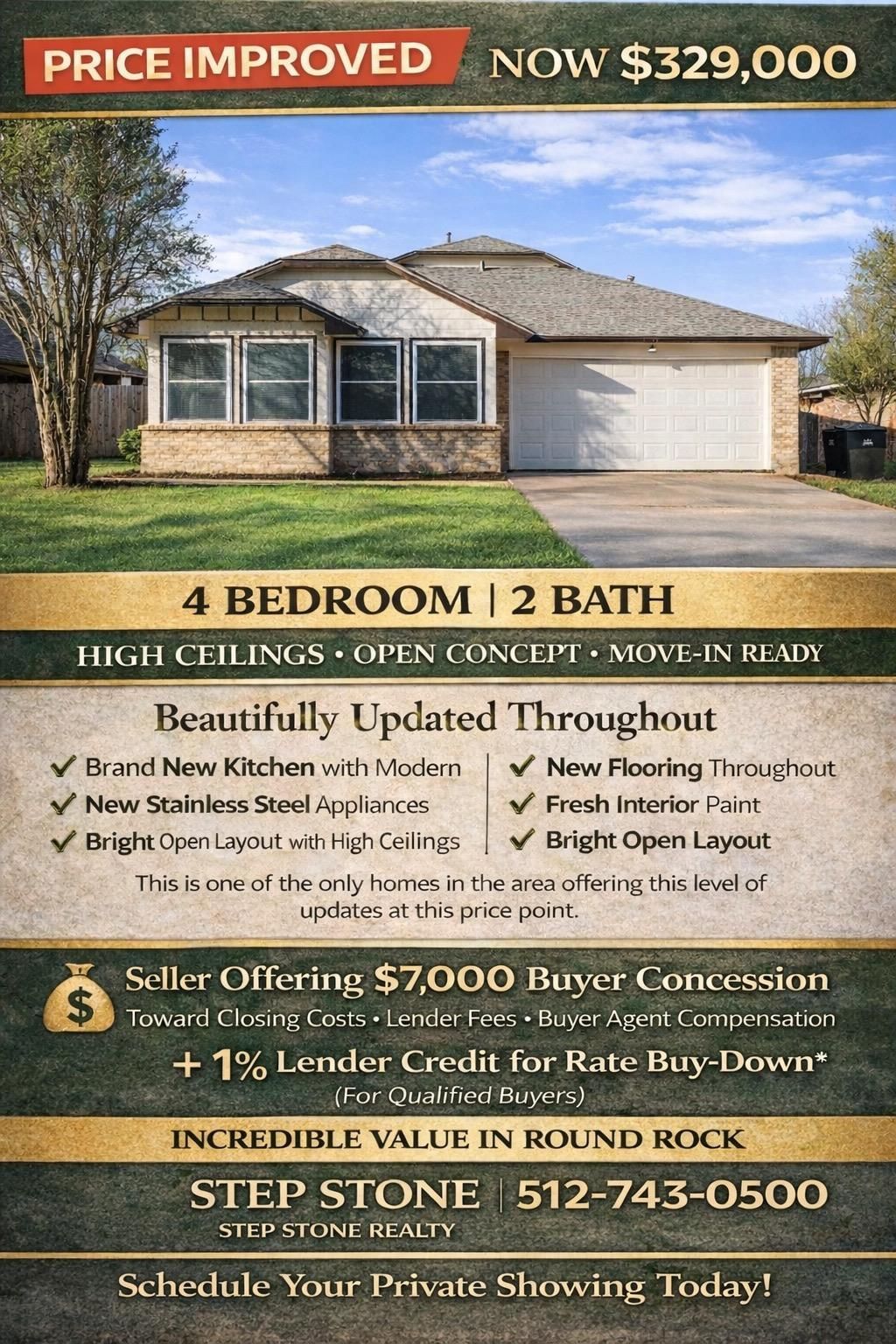 Welcome to this beautifully refreshed 4-bedroom, 2-bath home located in the heart of Round Rock. Step inside to discover soaring high ceilings and a bright, open-concept layout designed for both comfortable living and effortless entertaining.The home features a brand-new kitchen with modern cabinetry and new stainless-steel appliances, along with new flooring and fresh paint throughout, offering a truly move-in-ready experience. The spacious primary suite provides a relaxing retreat with a large walk-in shower and generous wall-to-wall closet space.Situated in a great, established neighborhood, youll enjoy convenient access to shopping, dining, parks, and highly rated Round Rock ISD schools.*** Buyer Incentive: Seller offering a $7000 buyers concession that can be used for closing cost, interest rate buy down or BAC also a 1% lender credit from 1st Quest Mortgage (Brandon)that can be used toward closing costs or an interest rate buy-down ? adding even more value for todays buyers.***Dont miss this opportunity to own an updated home with modern finishes in a prime Round Rock location ? schedule your showing today!