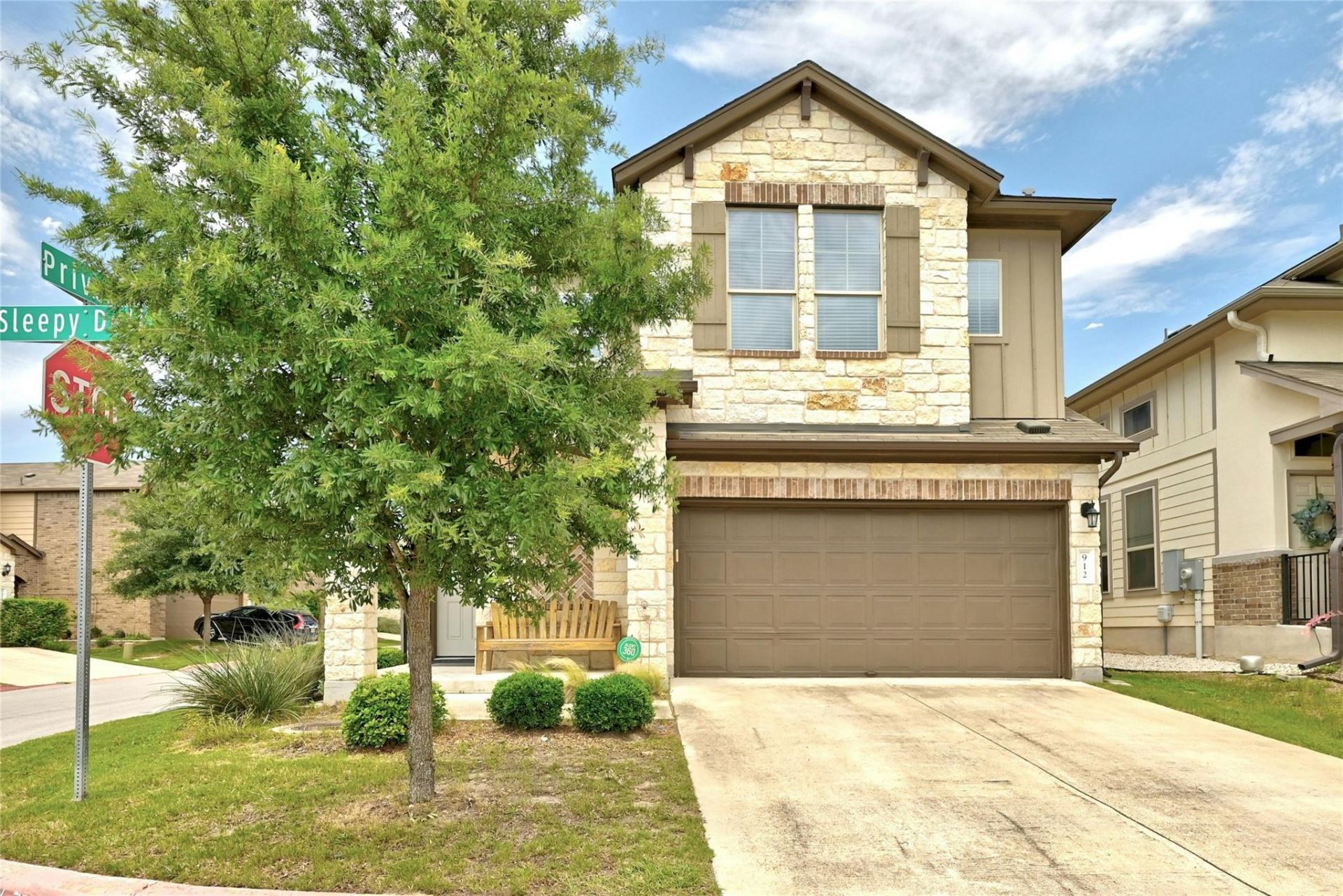 Welcome to your dream home in the charming Searight Village! This beautiful two-story residence offers a true lock-and-leave lifestyle in a single-family detached home within a condominium community. The condo owner's association takes care of exterior watering and landscaping, allowing you to enjoy a hassle-free living experience. Situated on a desirable corner lot, this home boasts enhanced privacy and an attractive stone exterior complemented by brick detailing. Enjoy outdoor living on the covered front and back patios. As you step inside, you'll be greeted by soaring ceilings and luxurious wood flooring that extend throughout the living space. The open-concept kitchen, dining area, and family room create an inviting space for entertaining and daily living. The kitchen features stainless steel appliances, granite countertops, rich wood cabinetry, and a center island with pendant lighting. The primary bedroom, conveniently located on the main level, offers wood flooring, a ceiling fan, a full bath, and a walk-in shower. The en-suite primary bath includes dual vanities, a walk-in shower, a walk-in closet, and a private commode area. Upstairs, the spacious gameroom overlooks the family room through stylish metal balusters and is flooded with natural light. The gameroom also includes a game closet for extra storage. Two secondary bedrooms share a full bath; one is currently set up as a study, while the other is oversized. Searight Village is ideally located near shopping, dining, and recreational opportunities, as well as public transportation. It provides easy access to Mopac and IH35.
